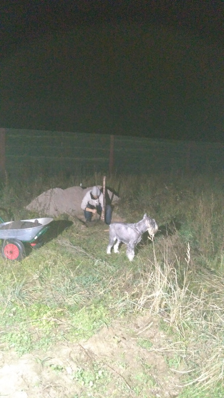 После внимательного изучения результата работ, было выяснено, что уровень поднят недостаточно, вероятно кольца несколько просели в мягком накиданном грунте. Так что мы оперативно разваляли верхушку приямка и, как у нас заведено, пошли жарить мясо на ужин.