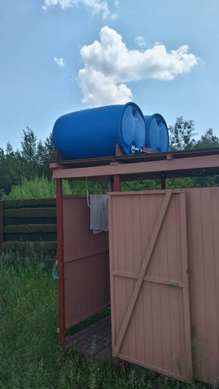 Погода внесла коррективы в наши планы, так что первым делом мы бросились собрать душ. Надо сказать, что хорошо продуманная конструкция позволяет быстро его монтировать, я молодец, приподнимите мне ноги. Собрали и закачали в него четыреста литров ледяной воды.