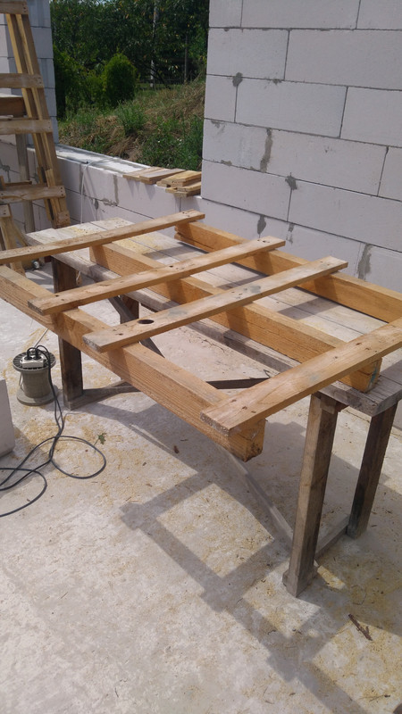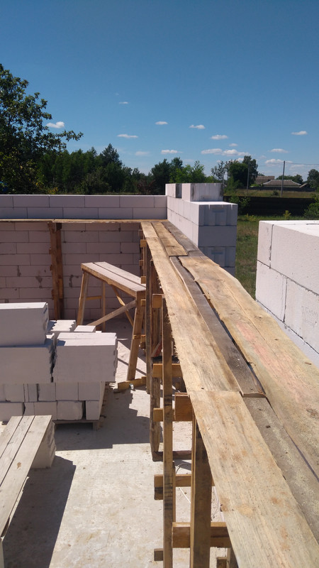 А блоки не добавились, потому что нашлись другие, более срочные дела. В основном, мы занимались изготовлением лесов. С козел двенадцатый ряд мы бы еще положили, а потом  все равно нужно было бы как-то поднимать уровень рабочей поверхности. Леса мы делали из поддонов, отрезая их часть и наращивая ножки стоек до метра восьмидесяти.
