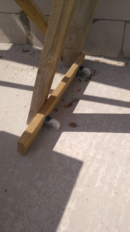Попутно прикрутили пару колес к козлам, теперь, их просто перемещать одному человеку. Нужно только приподнять с противоположной стороны.