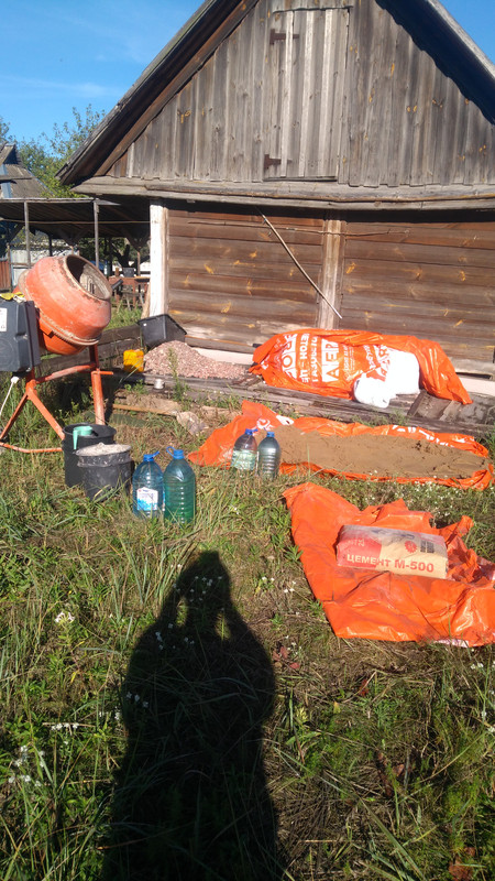 Как водится по традиции, во время первого замеса мы немножко бегали вокруг Большой Берты (это мы так гордо назвали бетономешалку), смешно размахивая руками и задорно покрикивая друг на друга.