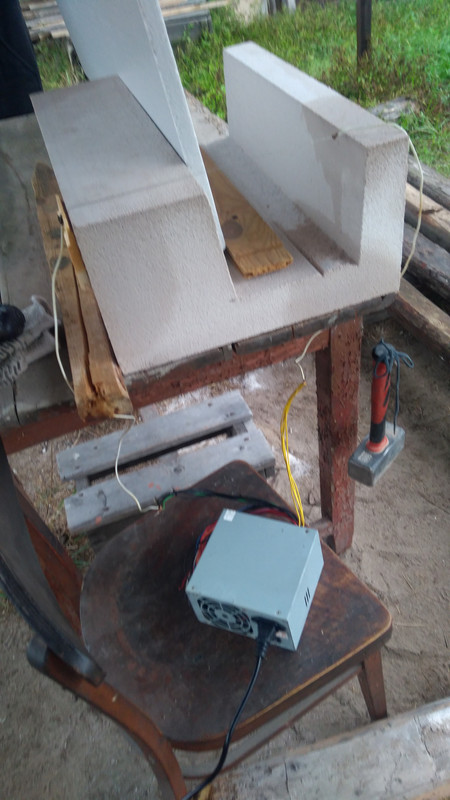 ЭППС уже нарезан, лихо получилось. Собрали мы на коленке терморезак и за час-полтора все нарезали. Обратите внимание на изящную конструкцию натяжителя нихрома с помощью кувалдометра.