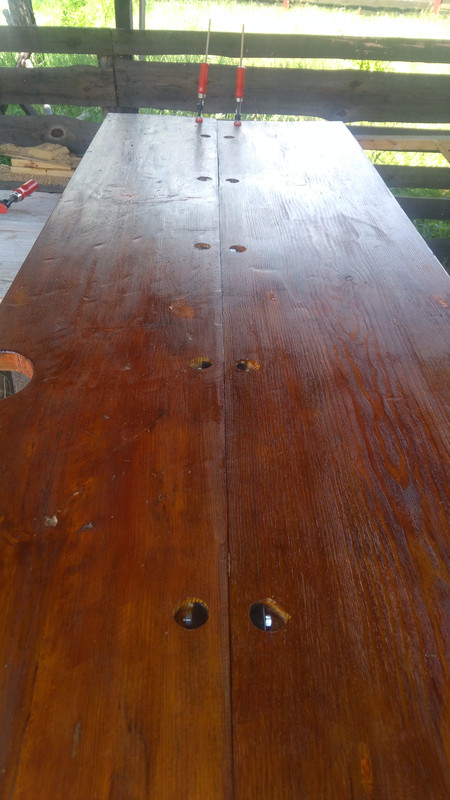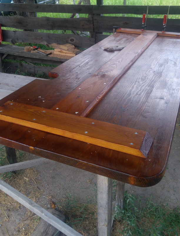 С парадной стороны зашлифовали стык (толщина досок по длине не отличалась постоянством, из-за чего возникла ступенька. Но мы ее легко убрали).