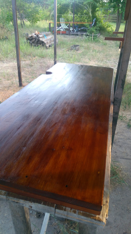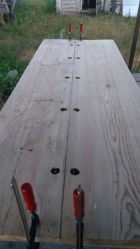 Ширины досок на полноценную столешницу не хватало, так что сделали ее из двух частей, со стыком по длинной грани. Для начала очистили щеткой от многолетних наслоений пролитых борщей и каш, обрезали гнилые края, прошлись рубанком, шпатлевкой и шлифмашинкой.