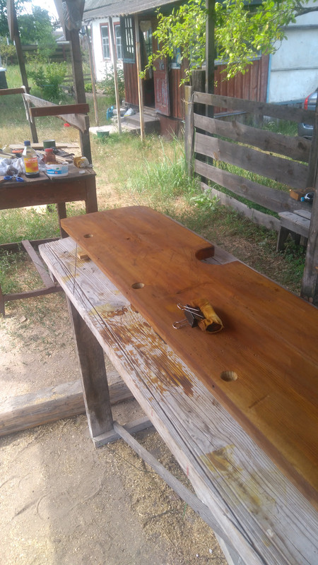 Пришла пора лакокрасочных работ. Изначально планировалось покрыть дерево качественным маслом, но доски оказались слегка покоцаны (шпоры? подковы? в летней кухне квартировал эскадрон гусар пахучих?) и немного поедены шашелем, так что было желательно скрыть эти дефекты по возможности.