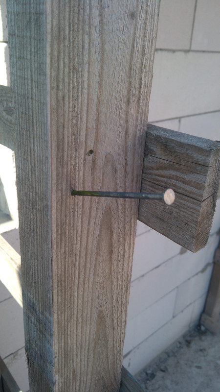 Серия состояла из двух выстрелов (ибо гвозди дорогие, а я экономен и рачителен) и уже вторым гвоздем я метко попал в стойку. Гвоздь вошел в древесину на 1,5 см, что довольно неплохо с точки зрения поражения живой силы противника.
