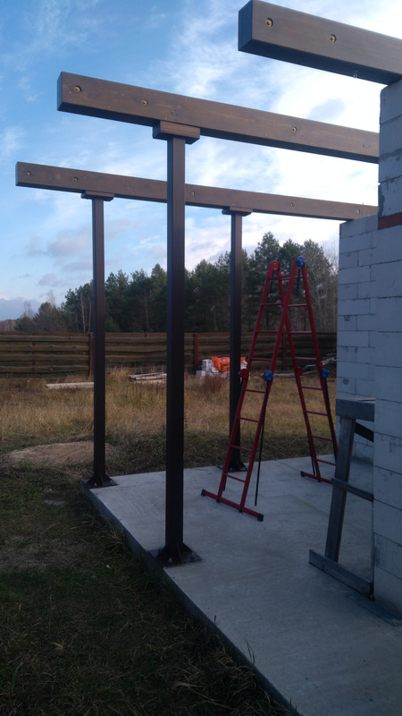В завершение – прокрасили балки еще одним слоем краски, а колонны решили перекрасить из серого в коричневый, что придало колоннаде строгий и стильный вид.