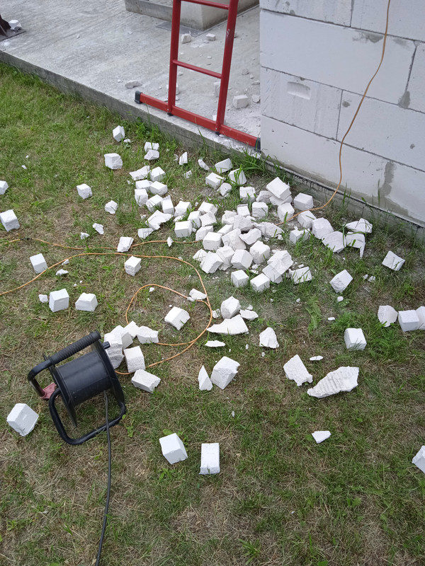 Ми взагалі прихильники Аерока, але його збанкрутували ще перед війною, тож вибирати особливо не довелося – Стоунлайт. Якість гірша, геометрія гуляє помітніше, але працювати можна. Найсмішніше, що в першій же пачці знайшлося два екземпляри по два нерозрізані блоки. Аерок такої ганьби собі не дозволяв. Розпиляли, звичайно, але що нас чекає в наступних палетах – поки що вкрито зеленим поліетиленом таємниці. Не виключаю суцільного кубика 1,7*1,2*1,0 м. Пардон, паралелепіпеда. Доведеться шукати пилку відповідної довжини.