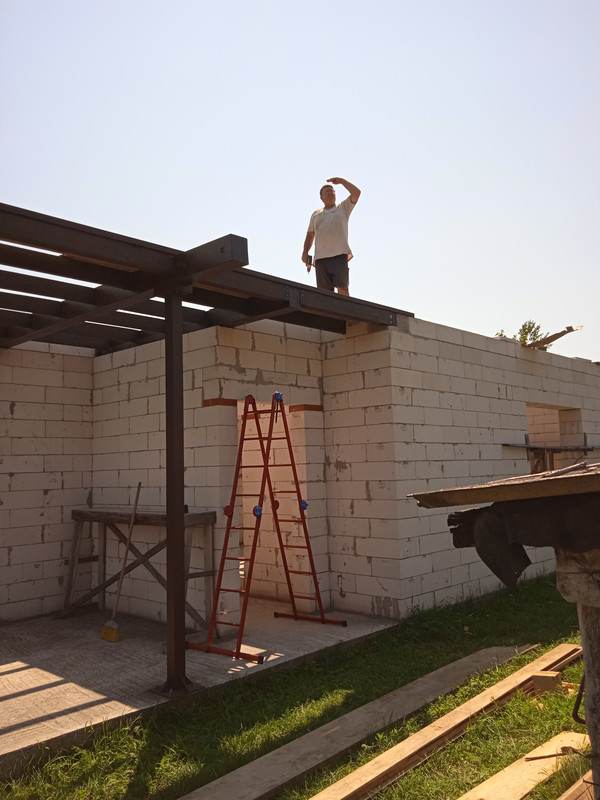 Паралельно зрізали гарними кубиками кутовий газоблок, тому що довелося трохи змінити конструкцію балок над терасою.