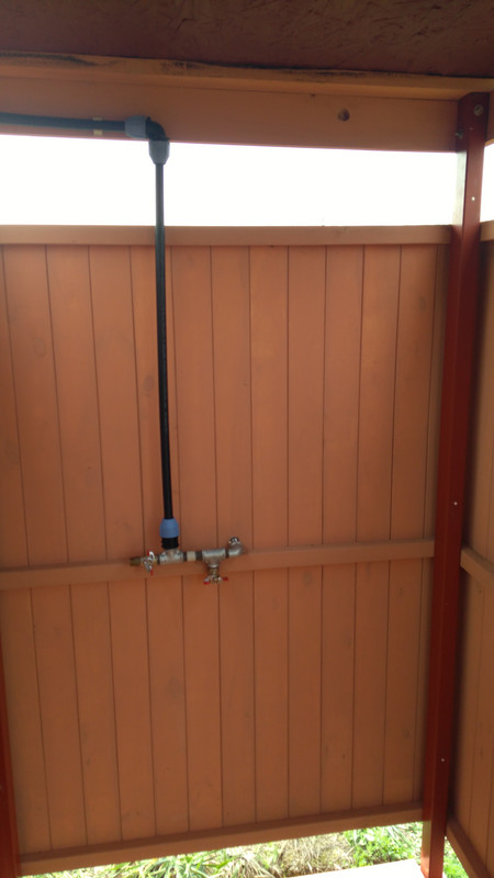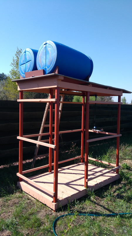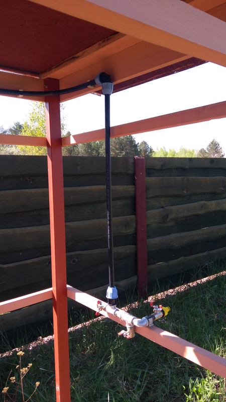 Солнце! Погода распогодилась и мы бросились наверстывать упущенное – занялись душем. Для начала устроили проверку системы на земле, обнаружили течь, перепаковали пару соединений. Затем взгромоздили бочки на их место, закрепили их и пошли крутить и гнуть трубы.