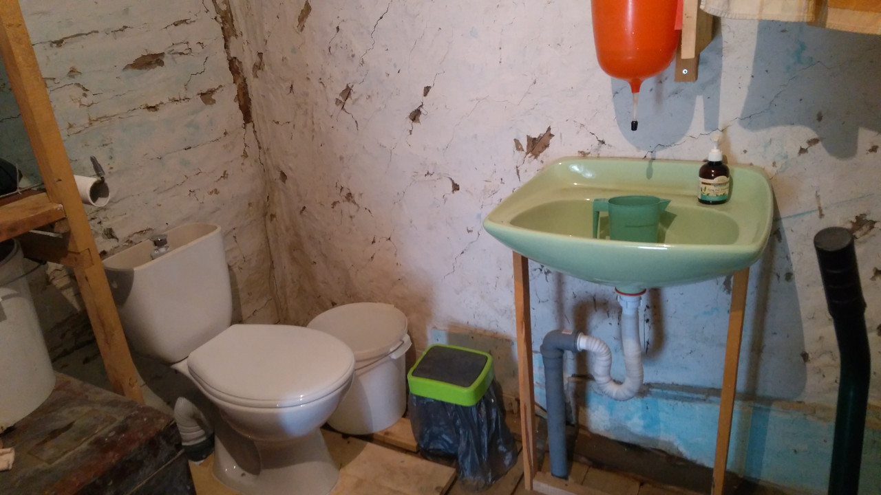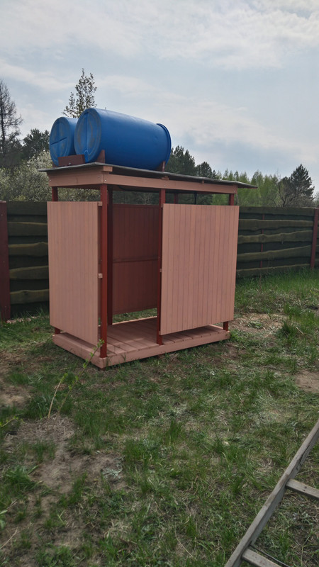 Осталось смастерить дверь и наполнить помещение полочками, вешалками и велосипедным насосом для джакузи.