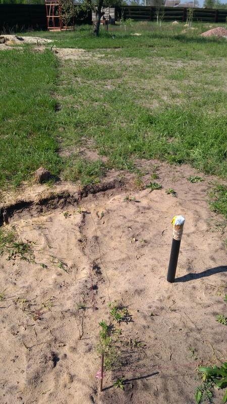 За трубой видна наметка для гильзы канализации. Она идет не так глубоко и будет заливаться прямо в фундамент.