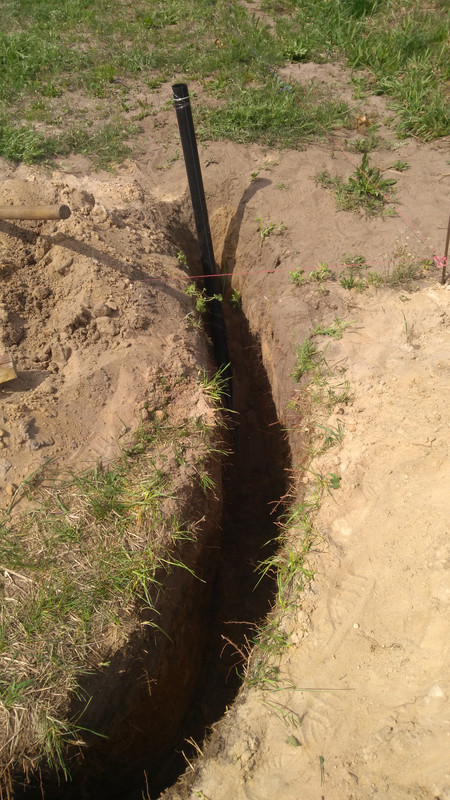 Приехали, разгрузились, затопили печь и сразу принялись за дело. Дело состояло в срочной закладке футляра-гильзы для последующего ввода воды в дом. Вот-вот начнется закладка фундамента (я надеюсь) и после этого просунуть под ним трубу будет несколько затруднительно.