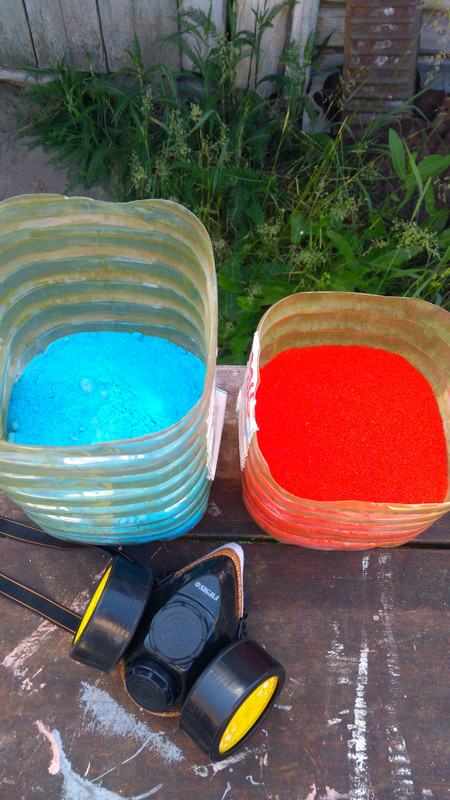 (Несмотря на то, что идея оказалась рабочей и фиксаторы фиксировали, в процессе работы отказались от этой методы, руками колыхать доску оказалось проще, практичнее и аккуратнее). Ванну простелили пленкой и занялись приготовлением раствора. Решили добавить ярких красок в жизнь и приготовили исходные компоненты.
