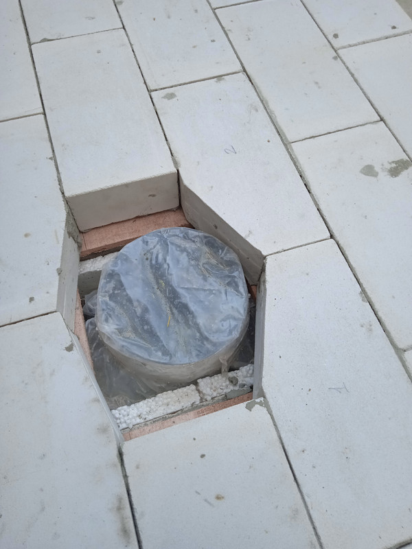 Продовжили роботи з фундаменту топки/димоходу. Для початку поклали трубу в її ліжечко і утеплили пінопластом.